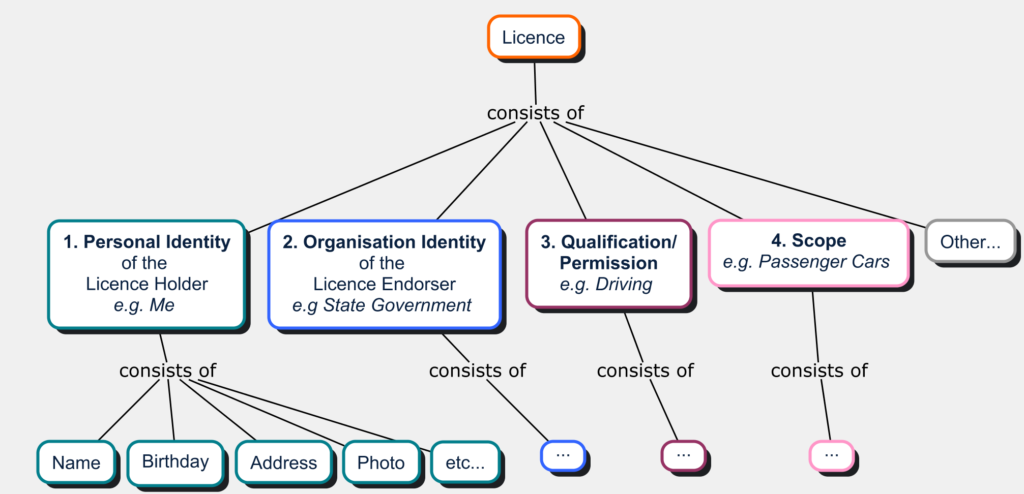 The licence link these four high-level pieces of information together. It ties the individual (me) to the endorsing organisation (the government) and to the activity (driving) and to the scope of the licence — the type of vehicle (car).